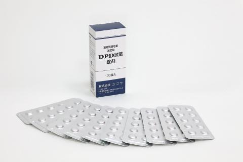 DPD試薬錠剤100錠入は、錠剤タイプの試薬となります。顆粒タイプと比較すると錠剤タイプは溶解速度が遅いです。本製品は溶解速度について、改善を施し溶けやすくなっております。